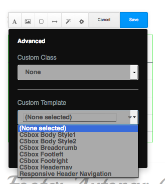 This should open up another set of icons that will help you customize the autonav block. Click on the cog icon and you should see a select box for custom templates. Here, you can choose the appropriate custom block for your autonav block. For more information about the autonav blocks click here : Autonav Custom Templates